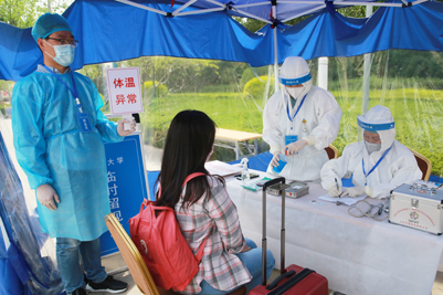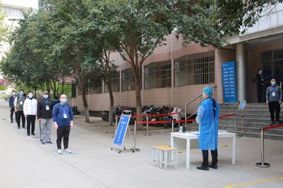 在各個場景的應急處置演練中,安全管理組工作人員負責秩序維護,并適時提醒學生佩戴口罩、有序排隊,按規定保持間隔距離;健康監測組工作人員逐一檢測學生體溫,發現有學生體溫異常時,工作人員立即引導其前往臨時留觀點等候,由留觀轉診組重測體溫,確認體溫異常時,啟動應急處置,校區負責人通知綜合協調、學生管理、安全保衛和后勤服務等專項工作組人員到達現場,布設警戒線、徹底消毒等相關工作。在學生返校進入校園的檢測查驗演練場景中,學校制作了健康通行碼,體溫正常的學生,在返校報到系統輸入個人正常體溫,進行掃碼確認后,由學生管理組工作人員核驗其校園卡、返校通行碼、健康通行卡,合格后進入校園。證件核驗不合格的學生,由學生管理組負責安排工作人員帶離處理。報到期間,發現有未按時報到的學生,學生管理組負責組織輔導員及時電話聯系,并根據具體情況采取相應措施。在食堂送餐演練場景中,食堂供餐人員按照學生定餐清單,按學生公寓樓號分樓層裝好餐盒,并填制交接記錄單。食堂供餐人員按學生公寓樓別送餐、交接餐、收回餐盒,核對并填寫交接記錄單;食堂按照規定做好餐盒消毒等工作。在圖書館應急處置演練場景中,學生一人一桌,自感不適時,即刻報告輔導員,輔導員引導學生至臨時留觀點等候,確認體溫異常后,啟動應急處置,并報告校區負責人。