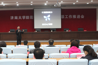 報告會上,濟南市公安局反詐騙中心二級高級警長楊玲講解了中心的運行情況,三級警長張秋陽作了題為《常見的電信網絡詐騙形式及防范要點》的專題報告。