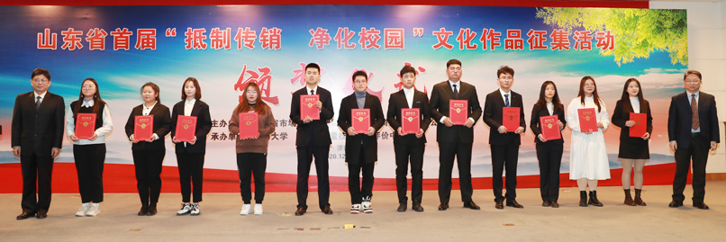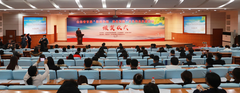 12月22日下午,山東省首屆“抵制傳銷 凈化校園”文化作品征集活動(dòng)頒獎(jiǎng)儀式在我校舉辦。山東省市場監(jiān)督管理局一級巡視員桂敦山、山東省教育廳副廳長戴龍成、山東省公安廳經(jīng)濟(jì)犯罪偵查總隊(duì)總隊(duì)長徐磊、學(xué)校黨委副書記王玉華、副校長楊景波、山東省教育廳學(xué)校安全管理處處長魏治法、山東省打擊傳銷聯(lián)席會(huì)議辦公室主任李冠博、山東省公安廳經(jīng)濟(jì)犯罪偵查總隊(duì)一級警長劉秀子、濟(jì)南市市中公安分局七賢派出所副所長戴兵出席頒獎(jiǎng)儀式。學(xué)校辦公室、黨委宣傳部、黨委學(xué)生工作部(處)、黨委保衛(wèi)部 安全管理處、后勤管理與基建處、團(tuán)委等部門主要負(fù)責(zé)人和來自全省30所高校的主創(chuàng)團(tuán)隊(duì)、指導(dǎo)教師、校方代表以及新聞媒體共同參加頒獎(jiǎng)活動(dòng)。
