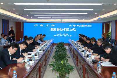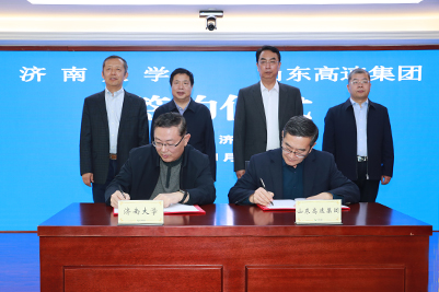 在簽約儀式上,濟南大學副校長張勇、山東高速集團執行總監左志武代表雙方簽署了“濟南大學-山東高速集團有限公司聯合創新研究中心”協議。