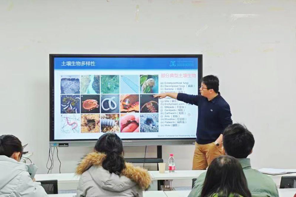 報告主要圍繞“土壤生物多樣性和多功能性”“植物和土壤微生物組”“土壤微生物調控”等方面展開。胡行偉副教授首先介紹了部分典型土壤生物,強調土壤生物多樣性在驅動生態系統功能中的重要作用,包括土壤/作物微生物組對作物性狀的調控,利用生物間的捕食關系促進溫室氣體減排和控制植物病原菌等,并以“全球作物微生物組項目”和“新型化學和生物肥料研發項目”為例,闡述了如何利用土壤生物為可持續農業發展和糧食安全作出貢獻。