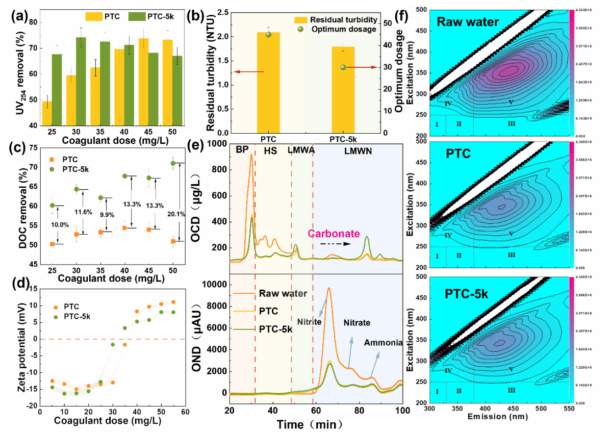 混凝效果實驗表明PTC-5k在去除有機污染物方面明顯優于PTC。與PTC相比,PTC-5k將有機物的去除率提高了約15.0%。此外,PTC-5k被證明在降低濁度水平方面非常有效,在最佳劑量下,PTC-5k的殘余濁度約為1.79 NTU, PTC-5k的DOC去除效率比PTC高10%?20%。在最佳劑量下,PTC-5k顯著提高了UV254和DOC的去除率,分別提高了15%和11.6%。隨后,使用SEC-OCD-OND測試討論了PTC-5k在有機物去除方面的具體優勢。 PTC-5k 的 BP去除率為54%。關于氨,通過混凝去除率約為40%。