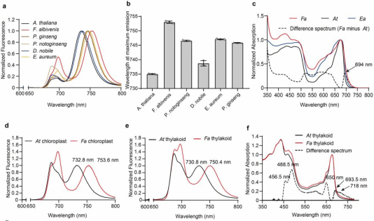 圖1:與擬南芥等高等植物相比,網紋草(Fittonia albivenis)具有紅移的吸收光譜和熒光光譜