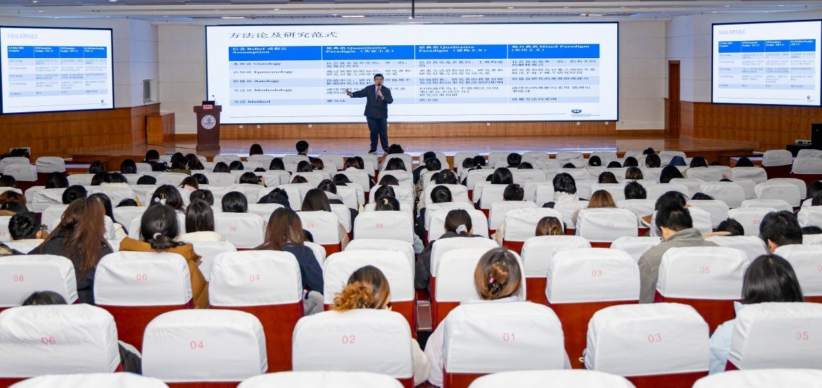 學術報告環節,黃泰然博士首先介紹了方法論的重要性及其演進過程,指出方法論作為關鍵的哲學概念,旨在描述人們觀察與處理世界事務的方式手段,與科學發展的歷史緊密相連;著重強調了方法論在理論構建進程中的關鍵意義,剖析了方法論及其研究范式的差異,明確定量研究與定性研究相輔相成的關系,進一步凸顯了混合研究的重要價值。在此基礎上,詳細闡釋了規范研究常用的理論及方法,總結了質性研究在實際應用中的重要地位,指出質性研究與實證研究相結合將有力推動學術研究與實踐的協同發展,并進一步強調了跨學科研究在管理學領域的關鍵意義。最后,為師生提出了寶貴的學習建議,鼓勵大家多讀優質文獻、扎實理論基礎并熟練掌握數據處理方法,以快速提升個人能力。