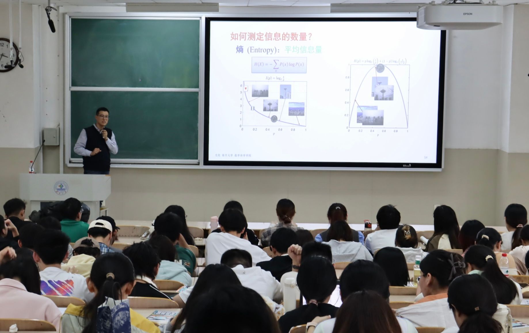 光炫回顧了信息論的背景和歷史,介紹了信息論之父香農(nóng),從“什么是‘信息’”“如何刻畫信息的數(shù)量”兩個(gè)基本問題入手,講解了“信息”和“信息量”的數(shù)學(xué)定義是如何建立的,進(jìn)一步闡述了信息論在生活中的應(yīng)用以及與其他學(xué)科的交叉與聯(lián)系、信息論未來的研究方向。光炫結(jié)合自身科研經(jīng)歷,深入淺出地講解了現(xiàn)代數(shù)學(xué)理論的發(fā)展脈絡(luò)及其在人工智能、密碼學(xué)等領(lǐng)域的創(chuàng)新應(yīng)用。他通過生動(dòng)的案例和嚴(yán)謹(jǐn)?shù)耐茖?dǎo),展現(xiàn)了數(shù)學(xué)學(xué)科的獨(dú)特魅力與廣闊前景,并鼓勵(lì)學(xué)生夯實(shí)基礎(chǔ)、勇于探索未知領(lǐng)域。