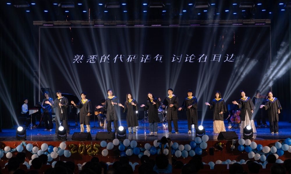 晚會在樂隊表演的《不說再見》和《閃耀》中拉開序幕,激昂的旋律里,唱出了畢業生們對校園的眷戀與未來的憧憬。隨后,學院李童童老師帶來大氣磅礴的獨唱《和諧中國》,用歌聲傳遞家國情懷,以優美旋律唱響時代華章。當《平凡之路》《你曾是少年》《鳳凰花開的路口》這些熟悉的旋律響起,臺下觀眾自發點亮手機閃光燈,化作星海隨節拍輕輕搖曳,全場沉浸在這場關于青春、成長與告別的集體回憶中。活力四射的舞蹈串燒《Funk Alarm》和《One Spark》中,2023級輔導員鄭威老師與Only Crew舞社的同學們以極具感染力的舞姿,完美演繹了青春的蓬勃朝氣與無限可能。在莊重激昂的朗誦節目《廉潔頌》中,用擲地有聲的語調、飽滿真摯的情感,為青春年華注入清正廉潔的責任底色。燈影戲《我們的四年青春》以其獨特的藝術形式成為最動人的“情感催化劑”,通過光影的魔力將大學四年的成長蛻變、青春追憶與離別愁緒娓娓道來,引發全場共鳴。畢業生們自己作詞改編的歌曲《二環南路的日子》,以飽含深情的歌詞和旋律,為全場帶來了一場對“濟大”的青春告白,讓四年的歡笑與淚水都在歌聲中得到了最完美的詮釋。在晚會的尾聲,一曲精心編排的歌曲串燒《光陰的故事》與《明天會更好》將現場氣氛推向高潮,當熟悉的旋律響起,臺上臺下共同哼唱,共同譜寫畢業季最動人的青春樂章。